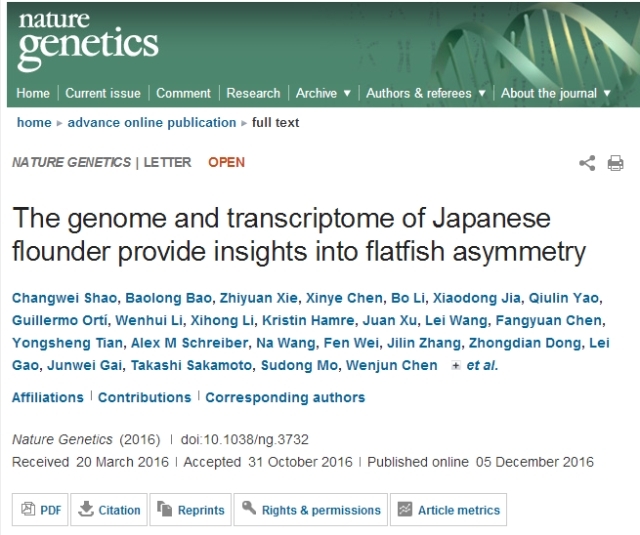 2016年12月6日,著名杂志《Nature Genetics》(影响因子31.616)在线发表中国水产科学研究院黄海水产研究所陈松林实验室、雷竞技raybat竞猜鲍宝龙实验室、华大基因等单位合作的研究论文《The genome and transcriptome of Japanese flounder provide insightsinto flatfish asymmetry》(http://www.nature.com/ng/journal/vaop/ncurrent/full/ng.3732.html))。鲍宝龙及其指导的硕士研究生陈新页作为共同第一作者(分别排第2和第4)。该论文完成了褐牙鲆全基因组解析并揭示了光传导通路调控变态过程眼睛移动和体色左右不对称建立的机制。