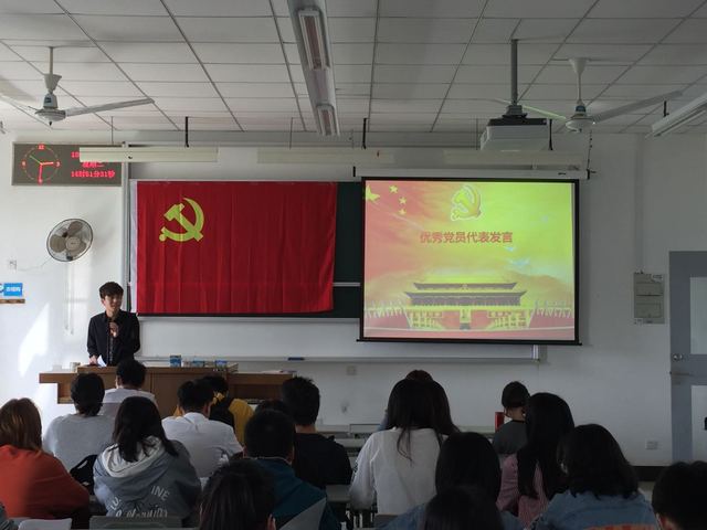 入党积极分子代表文登鑫同学代表全体积极分子发言。她表示:在今后的学习和生活中,她将会以身边这些党员作为学习榜样,努力学习他们吃苦在先,无私奉献的精神,学习他们自强不息,艰苦奋斗的精神。要用一名共产党员的标准严格要求和鞭策自己,更好地为身边的人服务,为所热爱的事业贡献自己的青春和力量,也为党的建设做出应有的贡献。争取早日站在鲜艳的党旗下宣誓,成为伟大的中国共产党大家庭中的一员。