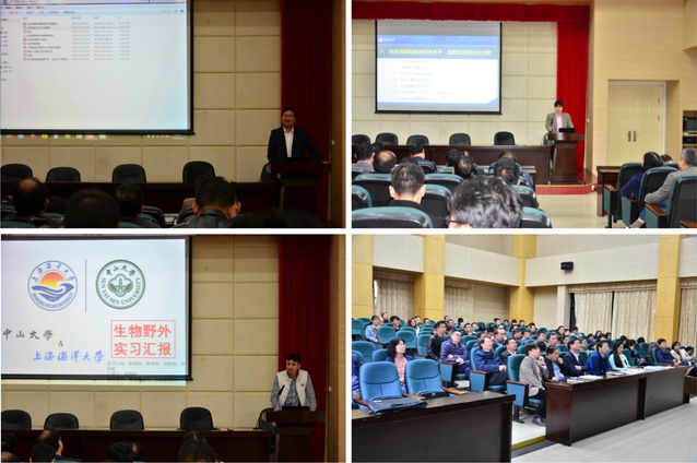 会议第二阶段为年度实践教学研讨会。黄旭雄副院长报告了2018年学院实践教学的实施概况,总结了学院年度实践教学的特色、亮点和不足,指出实践教学是学院提升本科人才培养质量的重要抓手,把学科优势和科研优势转变成本科人才培养优势,我们有很好的基础条件。之后参加马来西亚海外生产实习的刘泽康和孙萌同学,参加全国生物科学野外实习联盟中山大学生物学野外实习的胡劭航同学代表实习学生分别汇报了各自的实习内容、实习收获和实习感悟。张瑞雷老师作为实习指导老师的代表分享了参与生物科学野外实习联盟中山大学生物学野外实习指导的感触和思考,介绍了我校的5位生物学同学在中山大学联合实习中的表现,充分地展示了我们海大学子的风采,为我校加入生物联盟实习开了一个好头。