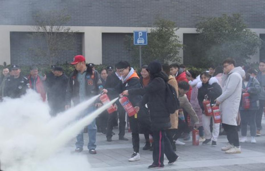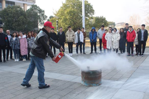 会议第二个环节,在校保卫处副处长王琼等多位老师的演示、讲解下,同学们在室外进行了消防演练,包括灭火器和灭火毯等工具的使用方法和注意事项,大家都积极踊跃参与进来,效果良好。