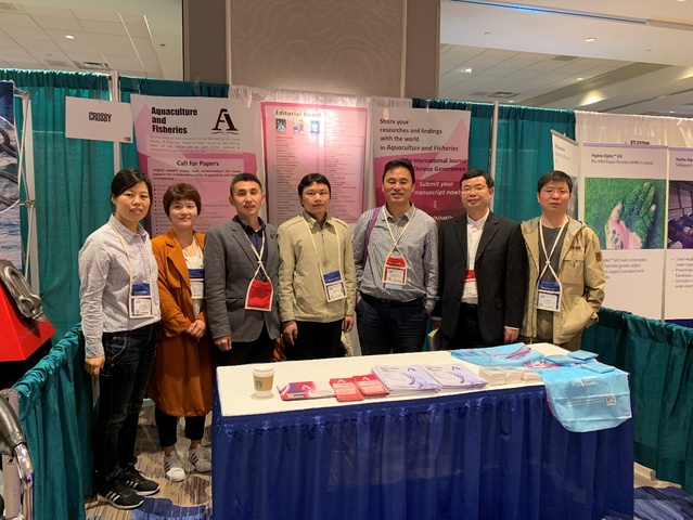 与会教师在我校《Aquaculture and Fisheries》杂志展台前合影