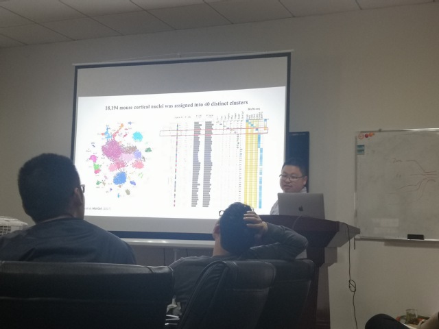 胡鹏博士首先介绍了单细胞测序技术的研究进展以及多种高通量测序技术优缺点,对于一些较难分离完整单细胞悬液的组织或者冷冻样品,单细胞核测序技术有着明显的优势,胡鹏博士通过研发高通量高通量细胞核测序技术(sNucDrop-seq),系统的解析了小鼠大脑中40多种不同的细胞类型,其研究成果发表于cell子刊molecular cell。进一步利用这项技术解析了小鼠心肌症模型中不同细胞类型特异的调控网络,其成果发表于国际知名期刊Genes & Development. 随后介绍了最新正在研究中的新生转录本单细胞标记技术,通过这项技术可以在单细胞水平研究mRNA的代谢动力学。最后,通过展示单细胞测序技术应用于小鼠垂体上研究的例子,为我们揭示了如何通过这项技术来解决实际的生物学问题。引发与会人员的广泛兴趣。雷竞技raybat竞猜相关科研人员和研究生认真听取了报告,并就感兴趣的问题与胡博士展开了热烈的交流和讨论。