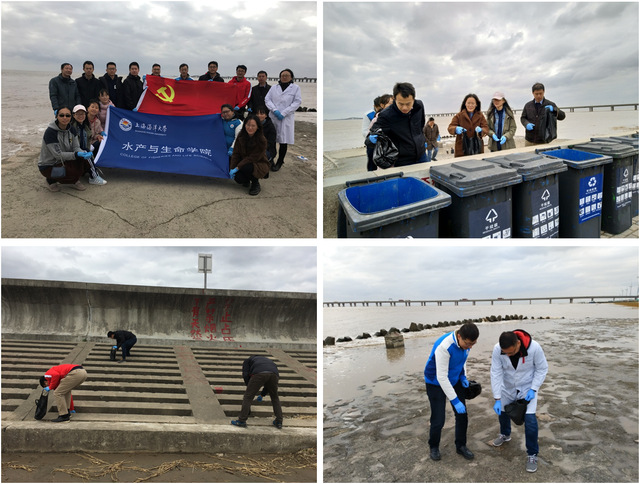 2019年11月29日中午,我校雷竞技raybat竞猜生物联合党支部和水产动物医学系党支部党员在支部书记杨金龙和宋增福带领下,利用中午挤出来的时间,发挥高校党员先锋模范作用,服务临港新片区生态环境,前往东海岸边东海大桥旁的滩涂上开展海滩垃圾清理活动。