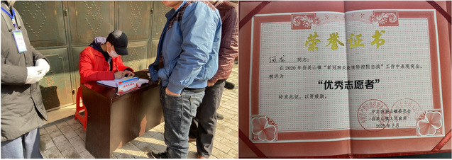 王璞同学从2月23日至26日,每天早八点至中午十二点,下午一点半至晚上六点在韦曲街道防疫工作站值岗,主要职责是对小区出入的居民进行登记和体温测量。按照当地要求和规定,小区给每个家庭发放出入证,每户每两天有1小时的时间可以派一人外出买菜,出行时都要进行登记。值岗过程中,遇到一些人员不配合工作,对此,王璞同学会耐心劝导,不厌其烦地给他们讲述防疫知识,确保小区居民的安全。