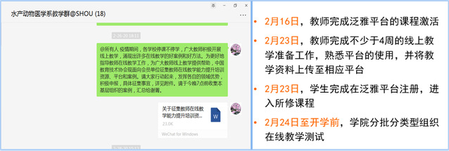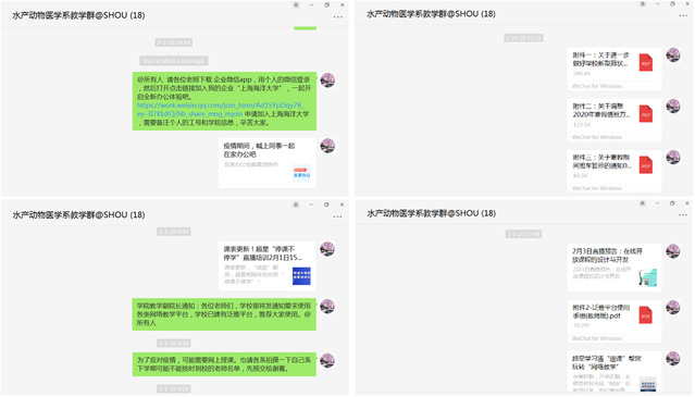 2020年春节刚过,就收到非常时期教育部和我校关于“停课不停学”的号召。为保障春季学期教学工作的准确到位与落实,雷竞技raybat竞猜水产动物医学系组织本系共计18名教师进行沟通与调整,最终核实本学期系内有14位专业老师担任共计29门次课程的教学。从2020年1月30日开始,在本系教学群里呼吁所有课程负责人学习在线授课的各种网络教学平台,鼓励各位老师筹备网上授课,引导所有任课老师下载在线办公app并加入在线办公程序。为保障在线顺利办公和教学工作的正常运行奠定了基础。