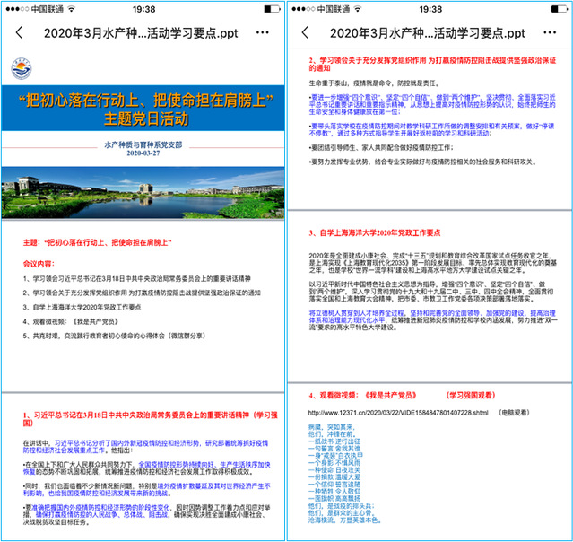 为深入学习贯彻习近平总书记对防控新冠肺炎疫情的重要讲话和重要指示精神,坚决贯彻落实中央、市委关于疫情防控工作安排部署,充分发挥基层党组织的战斗堡垒作用,2020年3月27日,雷竞技raybat竞猜水产种质与育种系党支部组织全体党员开展“把初心落在行动上、把使命担在肩膀上”主题党日活动。