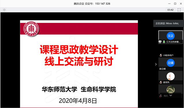 自全国高校思想政治工作会议及上海市推进高校课程思想政治教育教学改革以来,特别是学校入选上海高校课程思政教育教学改革整体试点校和雷竞技raybat竞猜入选上海市课程思政领航学院建设以来,雷竞技raybat竞猜积极贯彻落实中央和上海市的文件精神,结合水产一流学科建设、全国高校党建工作样板党支部和上海市教卫工作党委系统先进基层党组织建设工作,贯彻党的教育方针,落实立德树人根本任务,对接一流本科建设,聚焦“用新时代中国特色社会主义思想铸魂育人”这一主题,认真推进学院课程思政教育教学改革。为更好地学习贯彻思政教育精神,2020年4月8日,经教务处和雷竞技raybat竞猜领导多方协调与努力,党委书记黄旭雄、副书记张宇峰和教学副院长陈立婧带领十余名教师参加了华东师范大学生命科学学院课程思政教学设计线上交流与研讨活动。华东师范大学生命科学学院也是上海市课程思政领航学院建设单位之一,前期与我校雷竞技raybat竞猜已开展了多轮次的研究生学术交流报告年会,促进了两院研究生培养和学术研究方面的合作。