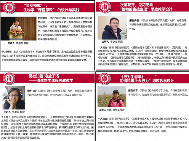 此次线上交流与研讨活动来自华师大生命学院一线教师多年的教学积累,尽管活动依托线上平台,但汇报内容干货满满,研讨氛围热度不减,“探究、合作、分享、励志”的教研文化洋溢云端,四位教师用自己多年的一线教学经验与大家分享如何采取不刻意、不突兀、不牵强的方式进行思政教育的无缝链接,从简单的知识传授转变为价值引领。