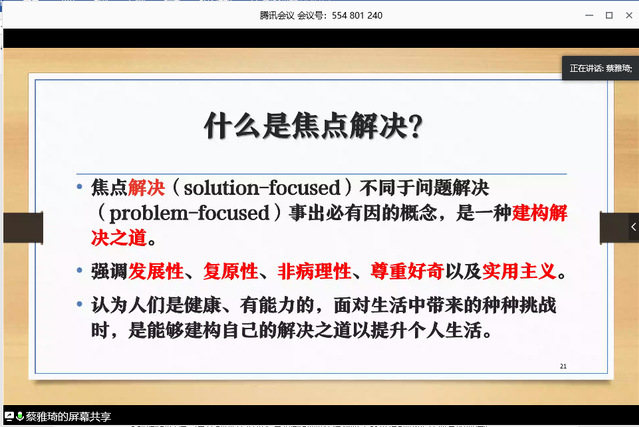 4月21日,为了提高心理筛查的准确度、提高辅导员老师跟学生谈心谈话的效果,提升辅导员队伍思政工作和学生心理危机预防的能力,雷竞技raybat竞猜组织开展了“焦点解决在学校谈话工作中的应用”在线培训。本次培训由上海电力大学心理咨询师、心理健康教育专家蔡雅琦博士在线主讲,学院全体辅导员参加。
