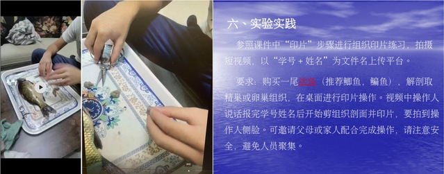 两位老师的线上实验教学以学校泛雅网络教学平台为主要授课载体,辅以微信平台实时对学生的动手操作视频进行点评和讲解。允许实验不成功,允许家长和学生完成亲子配合,鼓励学生独立完成操作。引导同学们在完全复学前掌握本课程实验室操作中的关键问题,为学生从宏观组织到微观细胞形态的认识转变打下基础,也为复学后学时压缩情况下的实验室教学打下了基础。