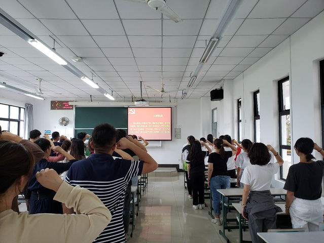 《国际歌》雄浑庄严的旋律响起,全体肃穆起立。聆听完毕后落座,由董绍建代表院党委宣读对预备党员的审批意见。而后,在正式党员代表张春燕同志的带领下,全体预备党员面向党旗,举右手握拳,庄严宣誓。80字的入党誓言,字字刚劲有力、掷地有声。