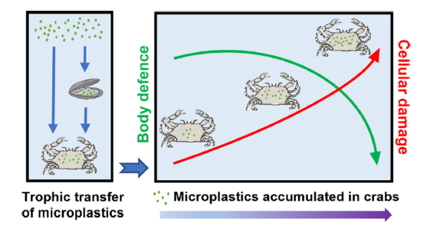 考虑到微塑料对食物链的影响,团队展开了微塑料通过食物相的暴露随着营养传递而产生的蓄积及其毒性的研究,以藻-贝-蟹作为研究对象,阐明了微塑料沿食物链在生物体中的富集效应及生理毒性。研究表明微塑料的富集没有产生生物放大作用,但激起了高营养级生物的氧化应激响应和防御抵抗。结果表明:蟹具有一定抵抗微塑料影响的能力,当防御机制难以抵抗微塑料暴露导致的压力时,生理功能将受损。