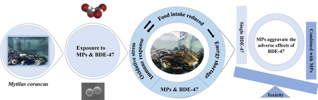 现实环境中多重胁迫因子与微塑料共存,团队聚焦于微塑料和海洋酸化的复合胁迫,发现海洋酸化可以增强微塑料对贻贝的消化系统和抗氧化系统的毒性;复合胁迫对消化系统的影响更为明显。研究表明:微塑料可作为载体负载海洋环境中的其他污染物。团队以多溴联苯醚(BDE-47)为典型污染物,从贻贝的免疫防御、氧化应激反应和能量代谢等方面揭示了微塑料作为环境污染物的载体如何影响贻贝的生活。研究发现贻贝在微塑料和BDE-47共暴露下减少了食物的摄入,但却试图通过增加耗氧量和改变能量供应方式来调节自身生理活动。研究表明贻贝能在短时间内积极应对这种恶劣的环境,但长期生活在这种压力源下的贻贝自我调节机制会紊乱最终导致生长和存活率下降。