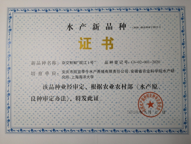 学校参与研发的杂交鲂鲌“皖江1号”新品种也同时获颁2020年水产新品种证书。