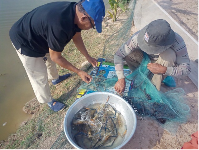 正在进行技术示范的柬埔寨稻田罗氏沼虾养殖