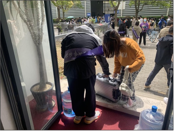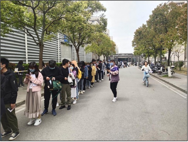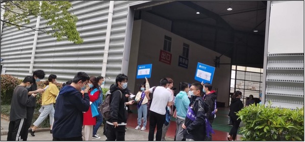 由于本次疫苗接种涉及雷竞技raybat竞猜和上海海事大学两所高校近万名教职工和学生,且接种对象以北生、武生以及科兴三种不同疫苗细分。当接种工作开始后不久,等待入场的人群就已经排起了长龙,甚至出现了部分师生蹲在地上填写知情同意书的场景。雷竞技raybat竞猜的志愿者们为了方便师生填写知情同意书,将学工办的部分桌椅板凳搬运到风雨操场5号门外供大家使用。看到部分海事大学和其他学院的学生由于忘记携带知情同意书而着急无助的情形,学工办老师决定将原本为本学院师生准备的备用知情同意书贡献出来,以解决兄弟学校、兄弟学院的燃眉之急,并准备了口罩和免洗消毒洗手液放在桌上供大家自取,同时迅速带领党员志愿者赶制指引牌,以张贴或人工托举的形式,醒目地引导师生有序排队,尽其所能提高接种效率。