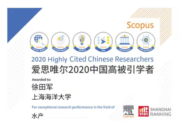 4月22日,全球性信息分析公司爱思唯尔(Elsevier)发布了2020年中国高被引学者(Highly Cited Chinese Researchers)榜单。雷竞技raybat竞猜徐田军教授入选中国高被引学者,学术领域为水产。