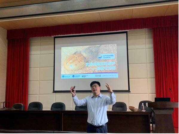 讲座开始之前,主持人王有基教授简单介绍了中华鲎的生物学特征,并对关杰耀教授主要学术成进行了介绍。关教授现任广西北部湾海洋生物多样性养护重点实验室(北部湾大学)主任。主要从事海洋珍稀生物资源与栖息地保护方面的研究。先后主持国家自然科学基金青年基金1项、地区基金1项,自治区自然科学基金青年基金1项。以第一(并列)或通讯作者在Journal of Environmental Management,Integrative Zoology,Biodiversity & Conservation等国际著名期刊发表研究论文21篇;入选八桂青年学者、广西高校引进海外高层次人才“百人计划”、广西高层次E类人才;获得2018年全国水生野生动物保护“海昌技术奖”,2019年钦州市五一劳动奖章。目前关教授担任的学术及社会兼职包括世界自然保护联盟(IUCN)鲎专家组指导委员会委员,同时兼任该委员会亚太区鲎工作组和自然教育工作组联合主席,国际学术期刊Frontiers in Marine Sciences客座副主编和评审编委、Springer专著副主编等。