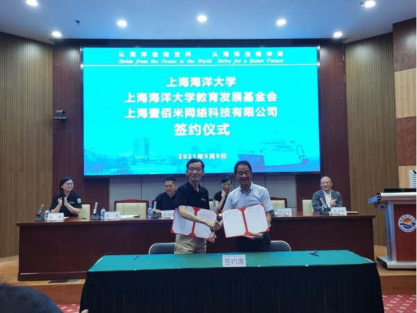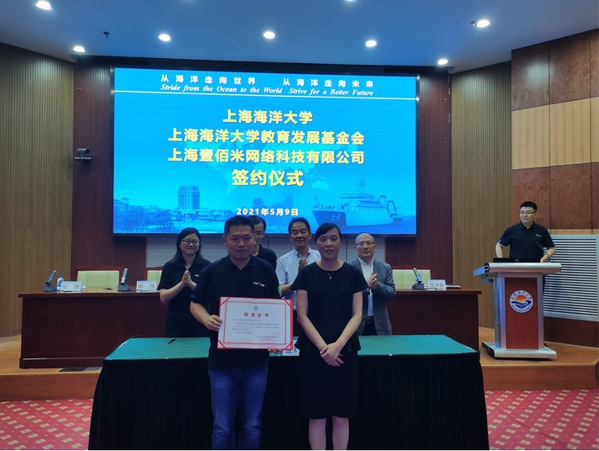 钟俊生和申强代表双方签订捐赠协议。本次上海壹佰米网络科技有限公司向学校捐赠220万元,郭爱萍为企业颁发捐赠证书。