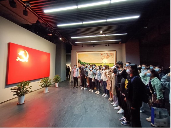 在龙华烈士陵园里,全体同学列队向烈士纪念碑敬献花篮,并在雄壮的国歌和国际歌中怀揣着深重和感恩之心缅怀先烈。随后,大家在工作人员的引导下通过历史照片、烈士文物等学习了256名革命英雄祖国至上、舍生取义的感人事迹。尤其是“龙华24烈士”的多媒体雕塑展,重现了龙华二十四烈士以风华正茂之年,坚守理想信念,慨然赴死的革命事迹,各位党员同志被先烈们的爱国情怀深深感动。最后,大家在庄严的党旗下,牢记入党誓词,重温入党初心。