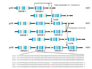 该文利用Nanopore长读长测序技术,以及Hi-C辅助挂载染色体组装策略,高质量地组装了染色体水平的波纹唇鱼基因组。该基因组大小为1.17 Gb,contig N50为16.5 Mb,序列完整性高达96.3%以上。注释了22,218个基因功能,转座子序列占基因组的39.88%。在此基础上,发现波纹唇鱼丢失了视觉基因SWS2A,但视觉基因SWS2B、LWS1和Rh2发生了重复。在gnl3l-hcfc1特定区域内,SWS2B具有4个重复。目前虽在少数鱼类中发现视觉基因的重复,但其机制尚不清楚。本团队利用基因共线性分析,发现SWS2B旁侧逆转座子SINE活动引起基因转换,促使染色体不同位点的同源序列形成。同源序列经二轮非等位同源重组(NAHR),产生了3个复制子,从而解析了该基因重复的分子机制。