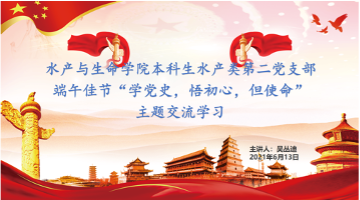 在2021年的传统节日端午佳节里,雷竞技raybat竞猜水产类第二党支部通过支部书记上党课和支部党员交流学习的形式,丰富了支部党员的过节生活,营造了浓厚的党史学习教育氛围。
