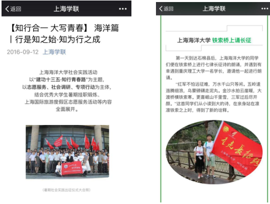 本次暑期社会实践是我校团委和马克思主义学院联手主办,得到了各部门、各学院的大力支持。自从活动开展以来,学院广泛发动,指导教师积极参与,学生踊跃报名,马院针对性解读了社会实践的意义和背景,开展社会实践技能培训。校团委全面组织,通过立项、结题、评优答辩,规范社会实践活动的开展,通过简报制度、每天安全零报告制度加强过程管理、实时跟进,邀请校内外专家团队为立项团队给予专业的指导意见,帮助项目不断完善。我校社会实践项目“悠悠长征情,青青中国梦”、“红色征行队”等项目的精彩风貌在”上海学联“微信公众号、文汇报暑期社会实践专题栏目上先后得到宣传展现。