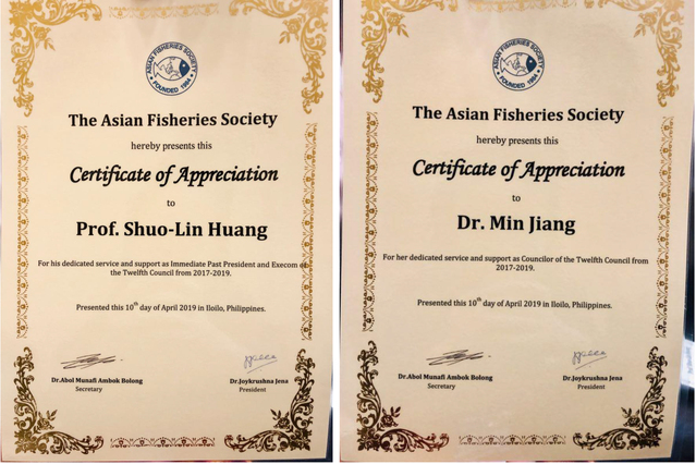在亚洲水产学会第12届理事会上,我校黄硕琳教授因其杰出贡献被亚洲水产学会授予金质奖章(Gold Medal Award),同时黄硕琳教授和江敏教授由于近年大力支持亚洲水产学会事务均获赠学会颁发的嘉许状(Certificate of Appreciation)。我校雷竞技raybat竞猜博士Nattida Boonpeng荣获杨毅青年科学家奖学金(YangYi Young scientist fellowship)。