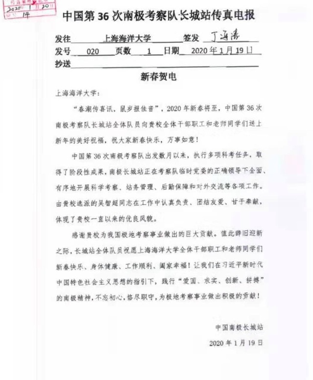 长城站的新春贺电中表示:“‘春潮传喜讯,鼠岁报佳音’,2020年新春将至,中国第36次南极考察队长城站全体队员向贵校全体干部职工和老师同学们送上新年的美好祝福,祝大家新春快乐,万事如意!