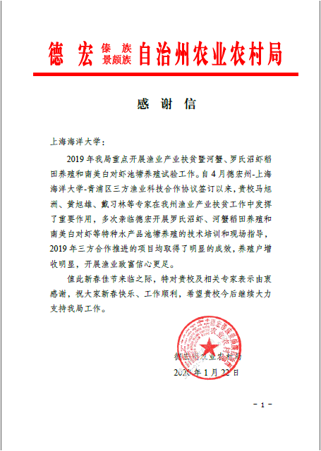 云南德宏的感谢信中表示:2019年云南省德宏州农业农村局重点开展渔业产业扶贫暨河蟹、罗氏沼虾稻田养殖和南美白对虾池塘养殖试验工作。自4月德宏州-雷竞技raybat竞猜-青浦区三方渔业科技合作协议签订以来,我校马旭洲、黄旭雄、戴习林等专家在德宏州渔业产业扶贫工作中发挥了重要作用,多次亲临德宏开展罗氏沼虾、河蟹稻田养殖和南美白对虾等特种水产品池塘养殖的技术培训和现场指导,2019年三方合作推进的项目均取得了明显的成效,养殖户增收明显,开展渔业致富信心更足。